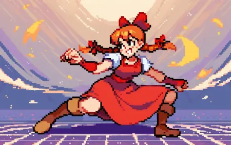 Recommended Prompts: "fighting stance, from side, open legs, detailed background, dynamic pose, full body, portrait, dynamic pose"