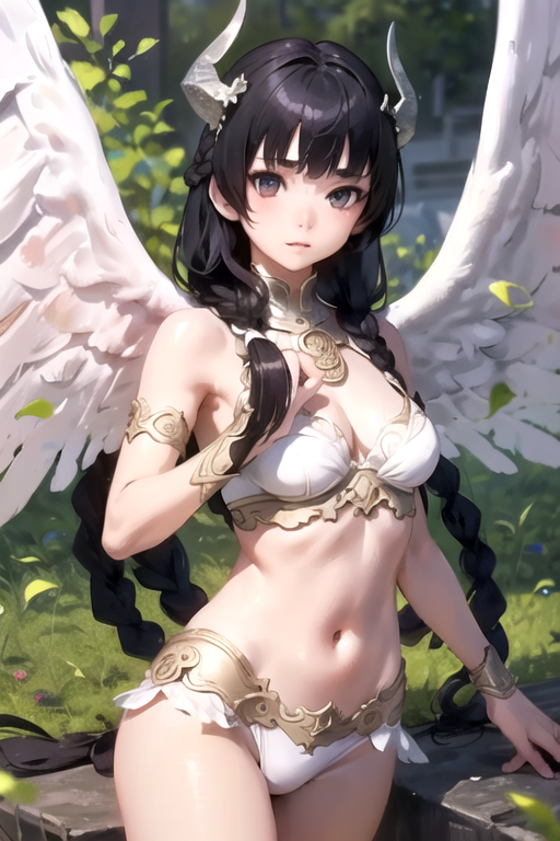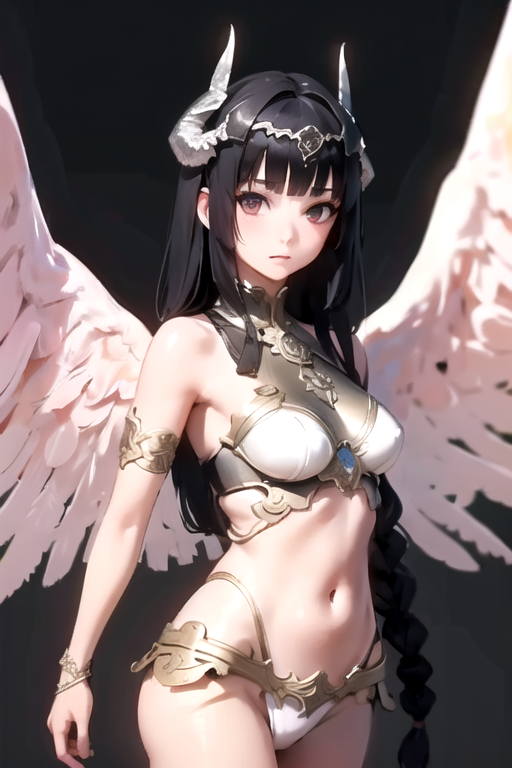 NaotoraWO4, 1girl, solo, long hair, looking at viewer, black hair, navel, bare shoulders, medium breasts, braid, angel wings, horns, midriff, armor, feathered wings, white wings,