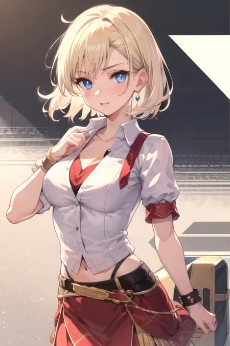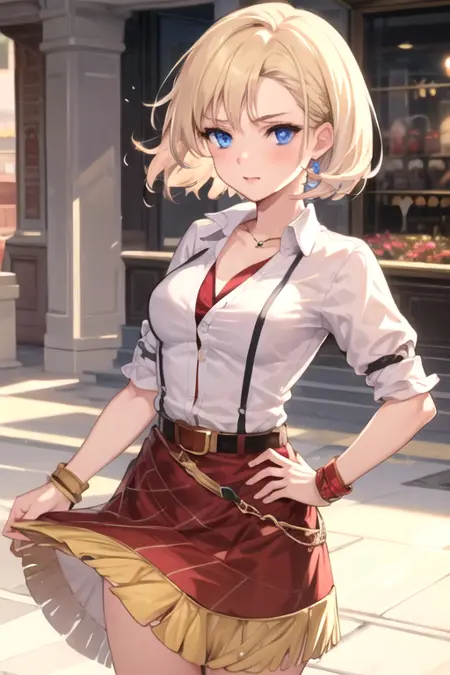 IseriaFrost, 1girl, solo, short hair, blue eyes, red skirt, blonde hair, white shirt, jewelry, medium breasts, short sleeves, belt, wristband, fringe trim