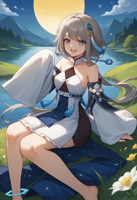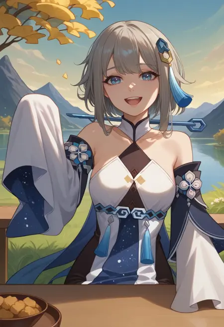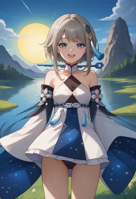 외모: guizhongdef, 파란 눈, 회색 머리, 긴 머리, 옆머리, 머리 장식, 끈 머리 장식, 작은 가슴