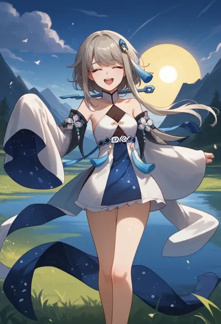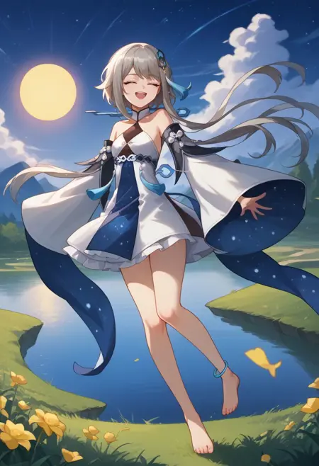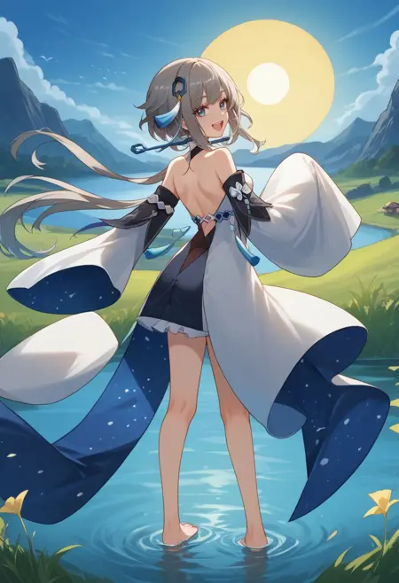 옷차림: 어깨 드러냄, 분리형 소매, 넓은 소매, 긴 소매, 손가락을 넘는 소매, 흰색 드레스, 헬터넥, 중국 전통복, 별이 빛나는 하늘 무늬, 끈, 발목걸이