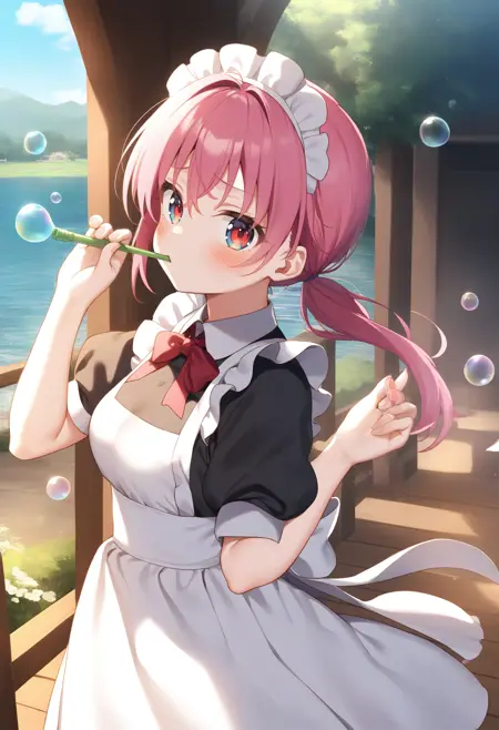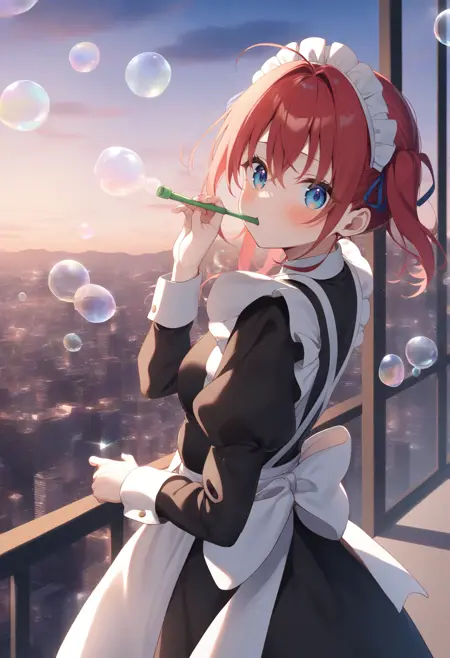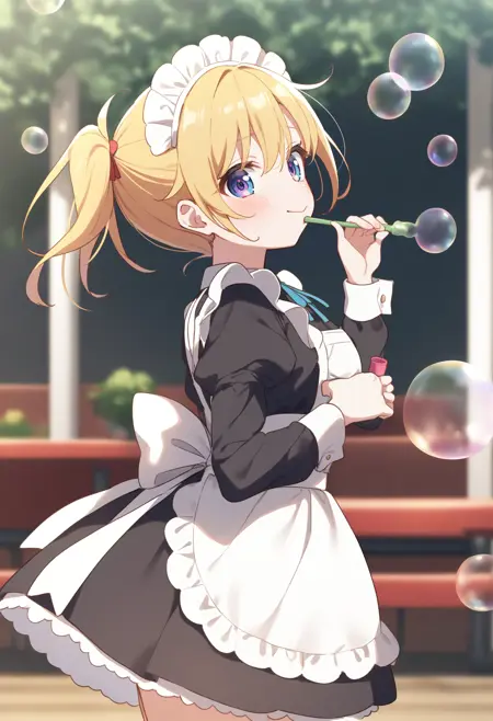 トリガー以外に「bubble」「bubble blowing」「bubble pipe」「outdoors」「day」「sky」などを追加すると、より自然な仕上がりになります。