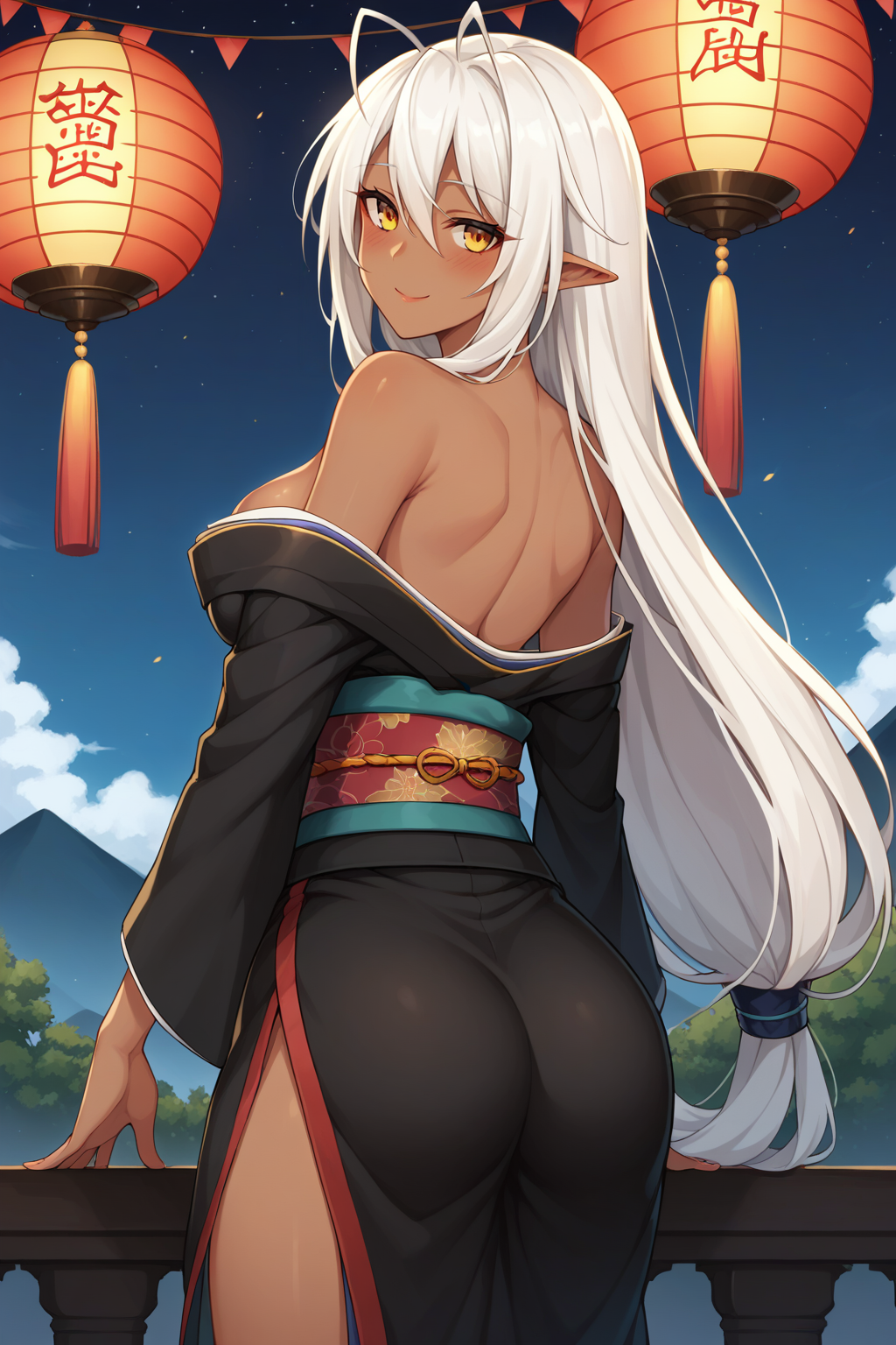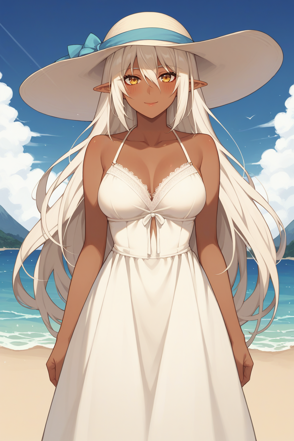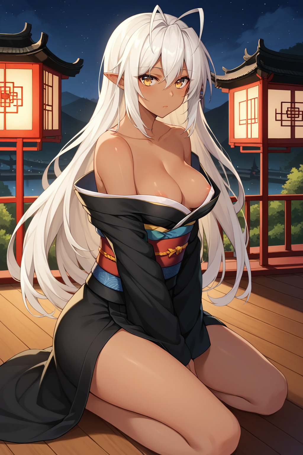 KJOsansei, long hair, white hair, yellow eyes, hair between eyes, dark-skinned female, pointy ears, antenna hair,