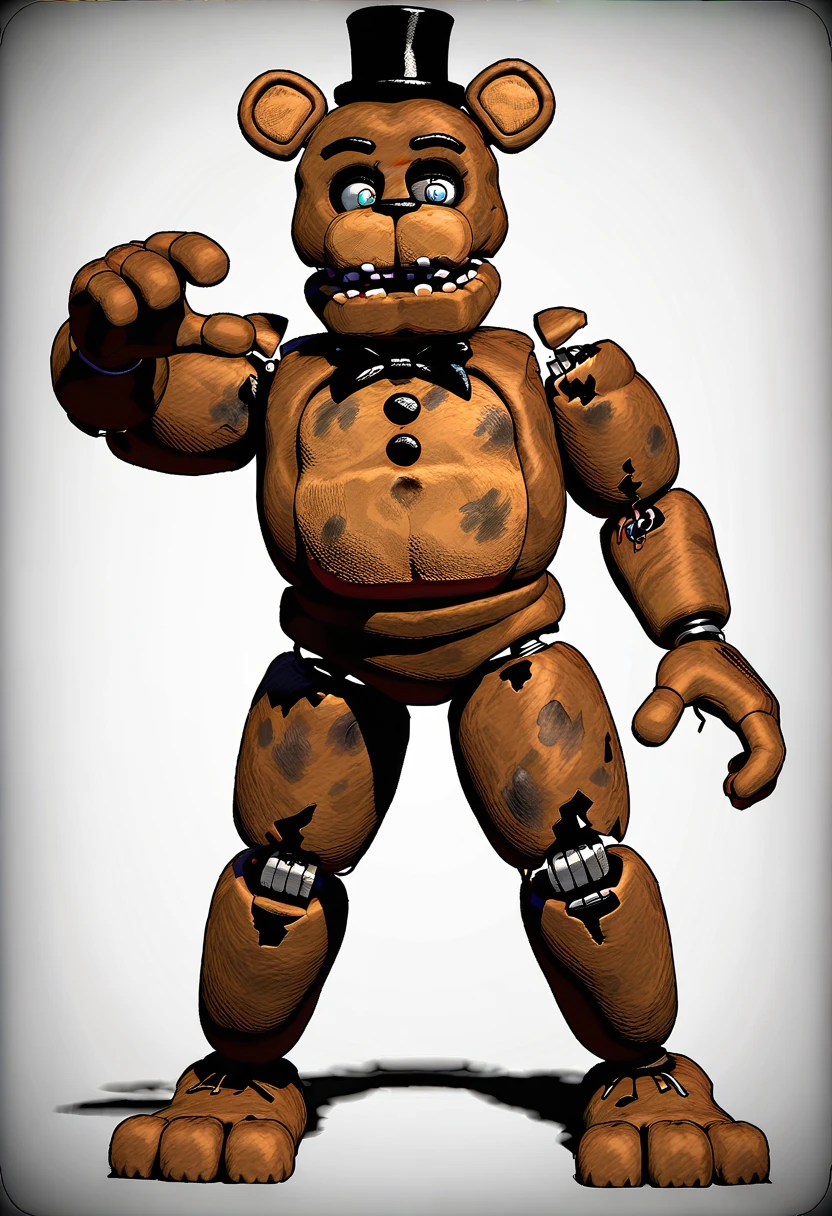 WitheredFreddyFNAF, 1boy, dirty dry brown fur, square teeth, thin black eyebrows, black top hat, small half-circle ears, dull blue eyes, black buttons and, black bowtie, withering, wires, horror, robot joints