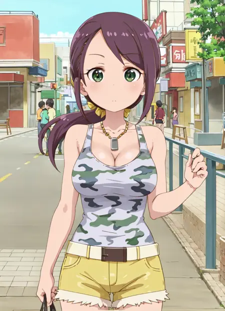 , 검정 무릎까지 오는 양말, 젠타이 루이키, 피부 형태의 반바지, 분홍색 신발, 슬리퍼