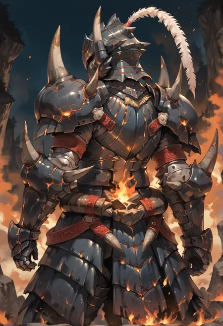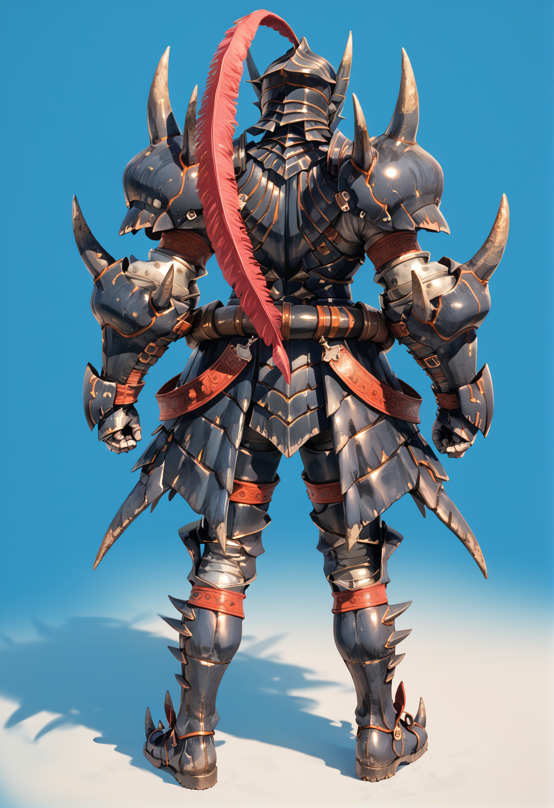 タグ(衣装):akantorアーマー、黒いヘルメット、黒い肩甲板、黒いアーマースカート、黒いガントレット、黒いアーマーブーツ、赤い羽、顔を覆っている