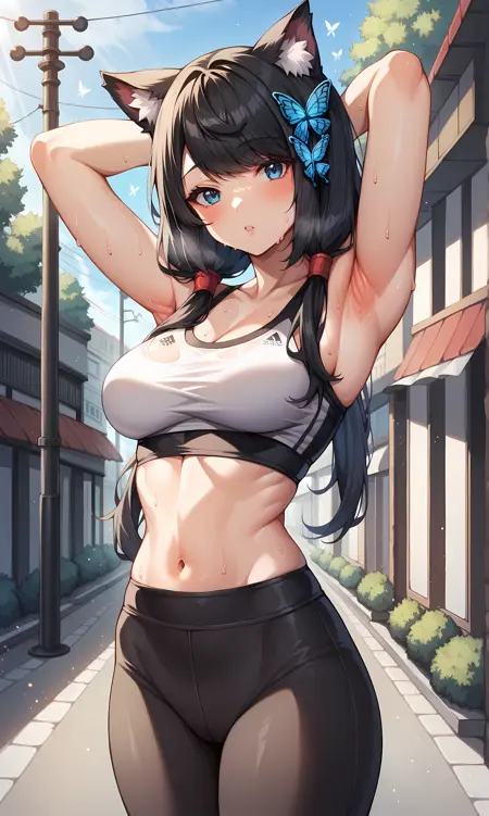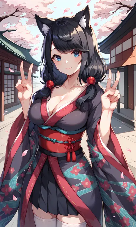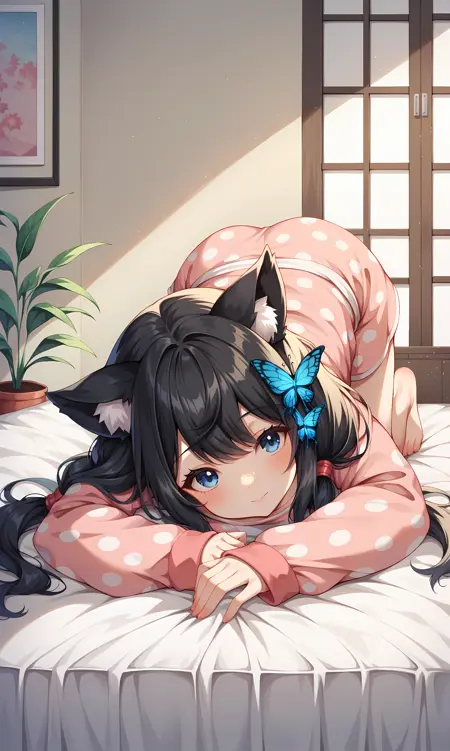 appearance: fusou, blue eyes, black hair, long hair, sidelocks, low twintails, cat ears, butterfly hair ornament, hair bow