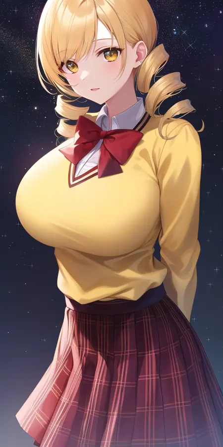 • mitakihara_school_uniform_yellow_sweater_long_sleeves_juliet_sleeves_white_collared_shirt_red_bowtie_pleated_skirt_plaid_black_miniskirt: 그녀의 학교 유니폼