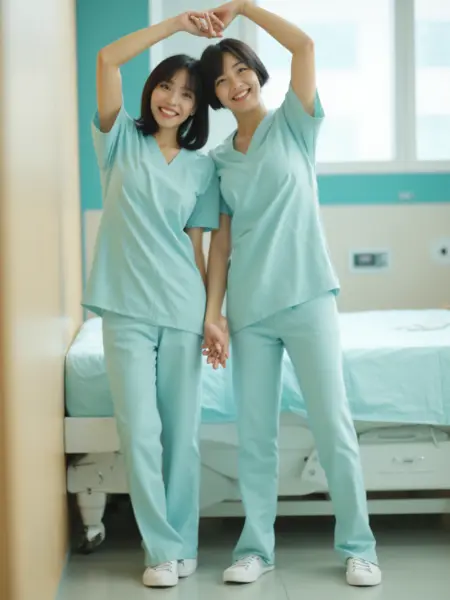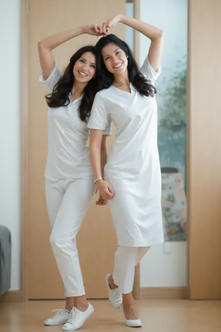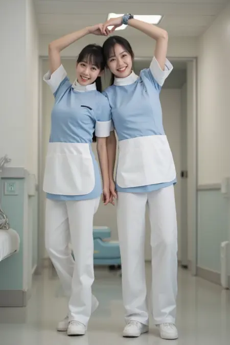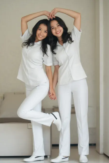두 명이 함께 팔로 심장을 만들기(또는 심장 팔)합니다. 이 버전과 단독(단일 개인) 버전의 차이점은 각 사람당 한 손팔만 사용된다는 점으로, 이로 인해 일관성이 떨어집니다.