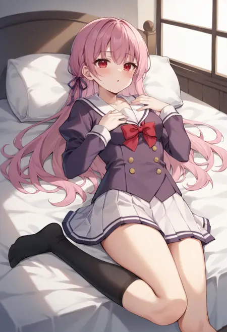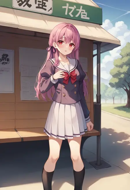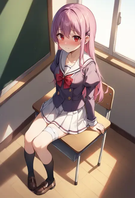 lavender school uniform,white sailor collar,red bowtie,puffy sleeves,black socks,white pleated skirt,bandaged leg,brown loafers,