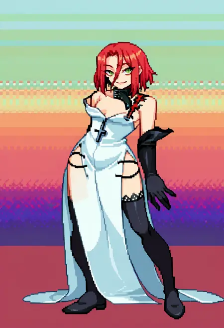 태그: 빨간 머리, 녹색 눈, 단발, 문신, 목걸이, 흰 드레스, 검은 장갑, 허벅지 긴 양말, 십자가, 측면 슬릿