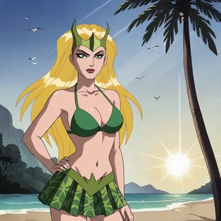 触发词:enchantressemh, 1girl, 金发, 绿色连衣裙, 中等胸部, 绿色眼睛, 深V领, 妆容, 口红, 裸露肩膀, 超级英雄, 手套, 婚礼护腕, 西部镜头