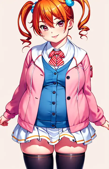 SD1.5版の衣装:ピンクのジャケット、ネックリボンタイ、青い閉じたカーディガンのボタン、手首より長い袖、ふわふわのロングスリーブ、白いスカート、黒の太ももハイストッキング、メアリー・ジェーン靴、
