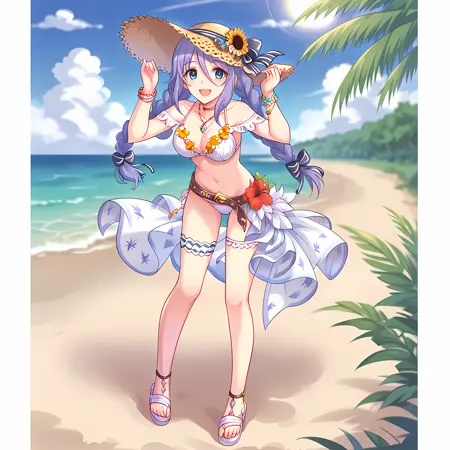 shizuru2, twin braids, blue eyes, purple hair, zulsw3 bikini, zulsw3 sun hat, zulsw3 bracelet, zulsw3 belt, zulsw3 sandals, zulsw3 necklace, zulsw3 thigh strap,