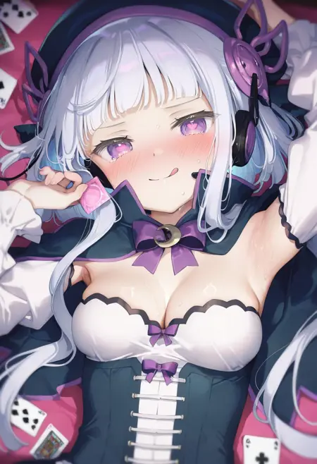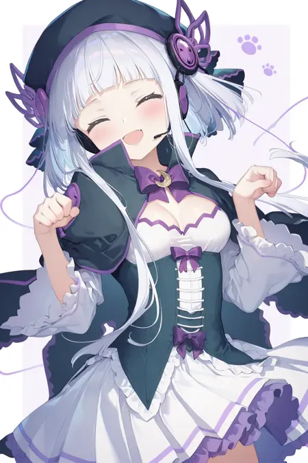 luna \(arcaea\), short hair with long locks, large breasts, short hair, cleavage, blunt bangs, headphones, frilled dress, hat,