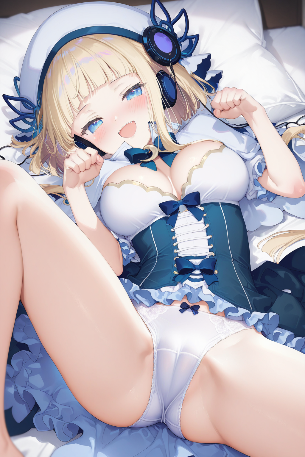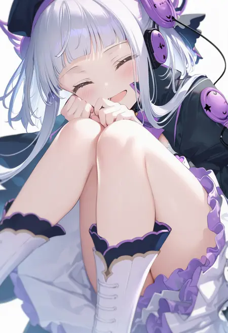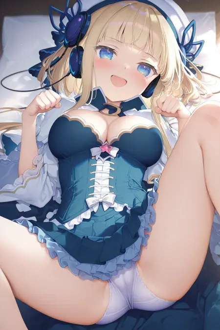 white capelet, blue dress, blonde hair, blue eyes, white hat, headphones,