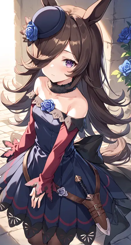 eyebrows visible through hair, flower, frilled skirt, frills, hair over one eye, hat, hat flower, horse ears, horse girl, horse tail, horseshoe ornament,