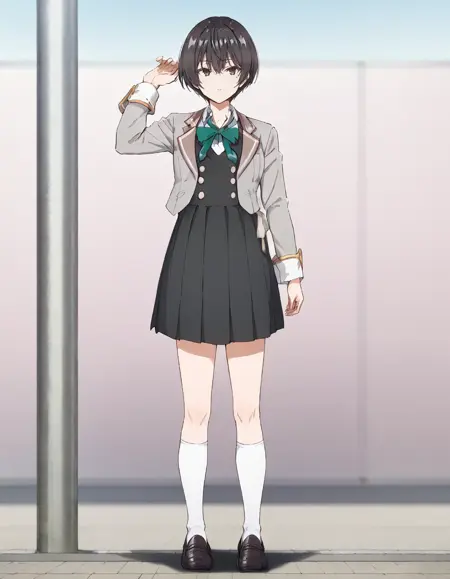 校服, 灰色夹克, 开襟夹克, 长袖, 绿色领结, 白色衬衫, 有领衬衫, 黑色背心, 扣子, 黑色裙子, 白色及膝袜, 黑色乐福鞋