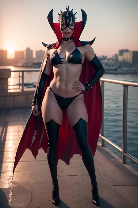 恶意服装:恶意,蓝色眼睛,比基尼,红色披风,胸部突出,全身,手套,乳房,骨盆遮布,面具,肚脐,单独出现,尖刺,大腿靴,高跟靴