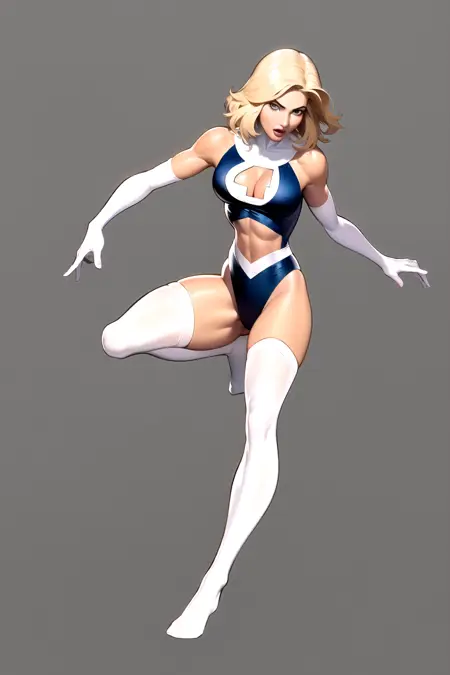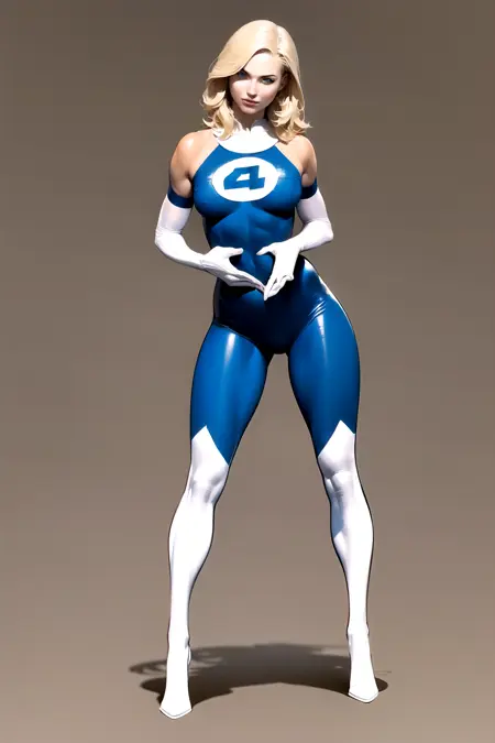 无袖服装:苏珊·斯托姆,蓝色眼睛,金发,蓝色紧身衣,裸露肩膀,白色护肘手套,白色长靴