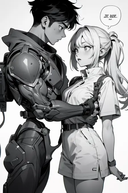 • (lineart, manga art), 1boy talking to 1girl, empty speech bubble