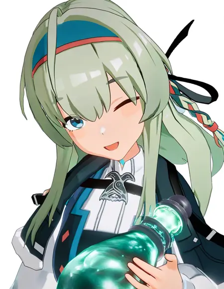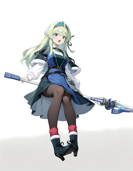 thrud-lei,1girl,solo,long hair,hairband,long sleeves,belt,green hair,white shirt,shirt,braid,capelet,dress,ribbon,hair ribbon,bangs,ahoge,