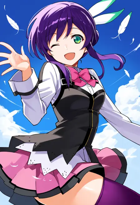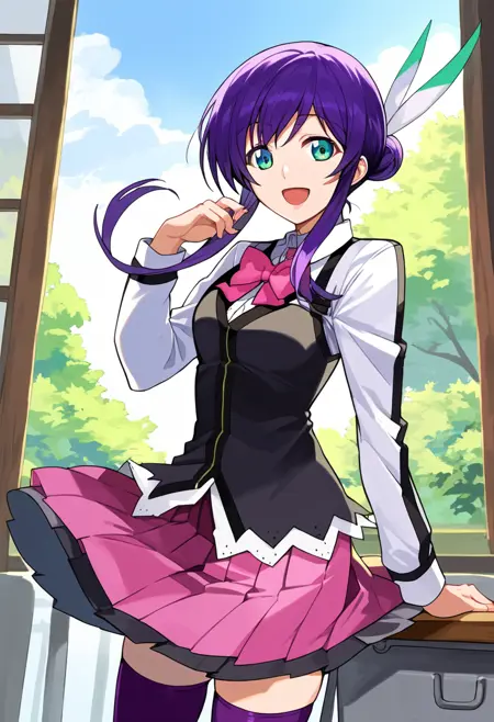 school uniform, pink bowtie, long sleeves, skirt, purple thighhighs, purple hair, feather hair ornament, short hair with long locks, single hair bun, gradient eyes, blue eyes, green eyes