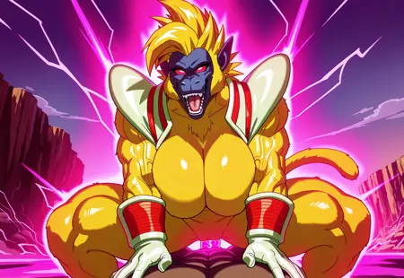 Positive Prompts: Oozaru, Furry, Yellow Fur, Primate, Red Eyes, Yellow Body, Tail, Anthro