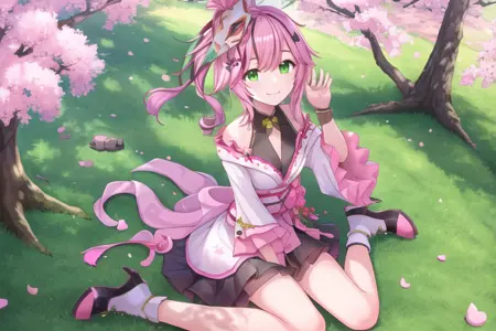 <lora:lan_1_(tower_of_fantasy):0.55>(high quality:1.1), (hige resolution:1.1), (clear light and shadow:1.1), lan 1 \(tower of fantasy\), light smile, pink hair with (black streaks:0.8), green eyes, kimono, hair ornament, mask on head