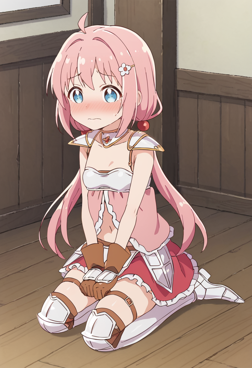 yusha-default,yuria shardet,blue eyes,pink hair,low twintails,hair bobbles,hair ornament,ahoge,bikini armor,pink dress,frilled skirt,(red skirt:1.1),thigh strap,armored boots,brown gloves