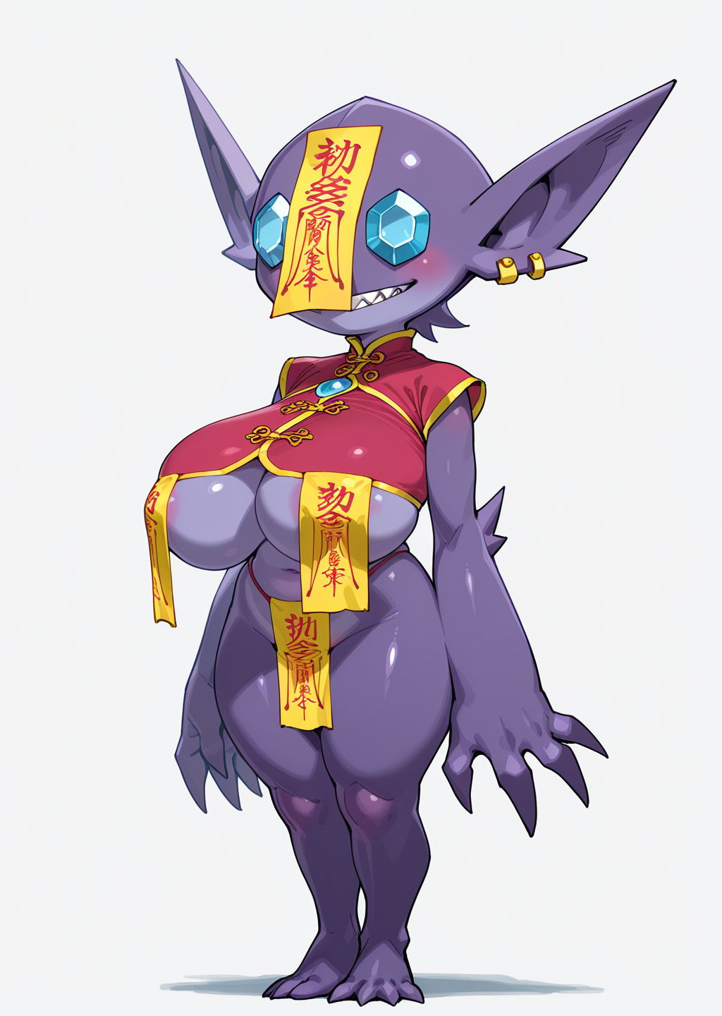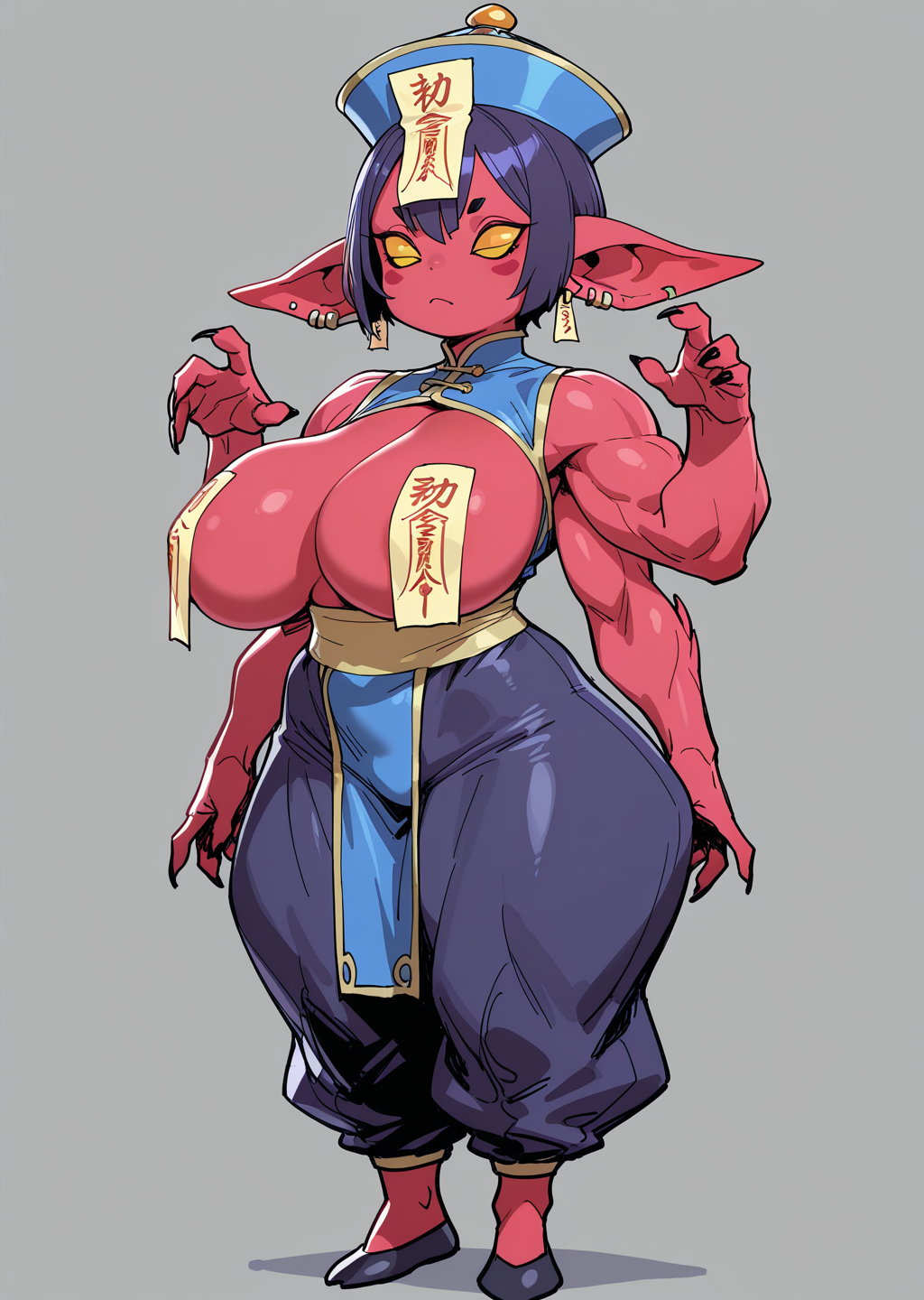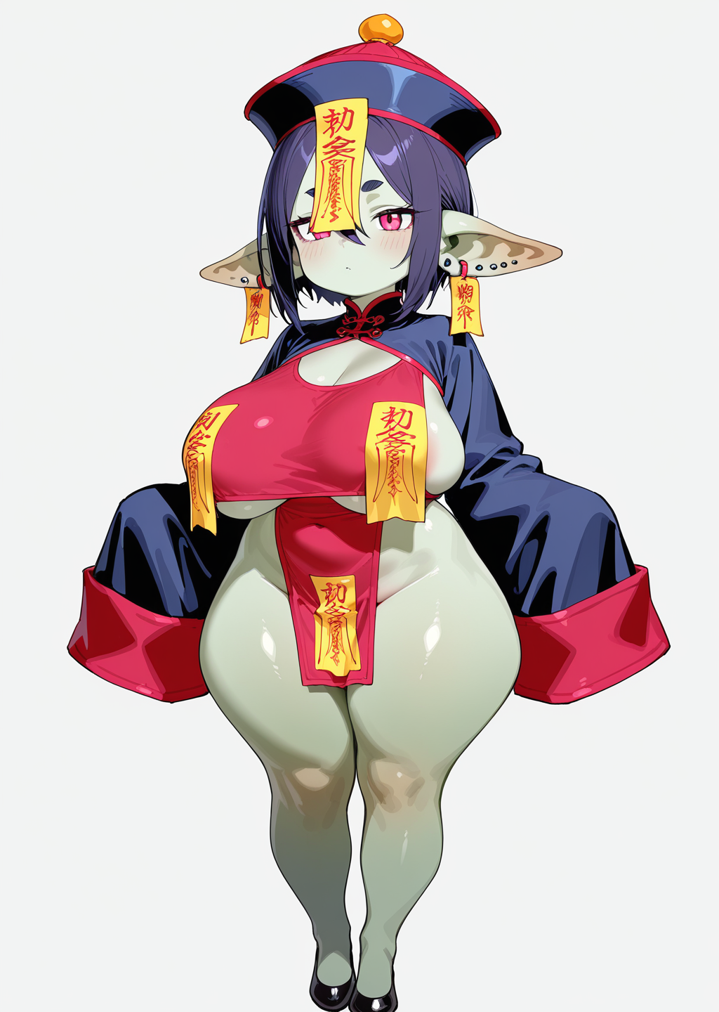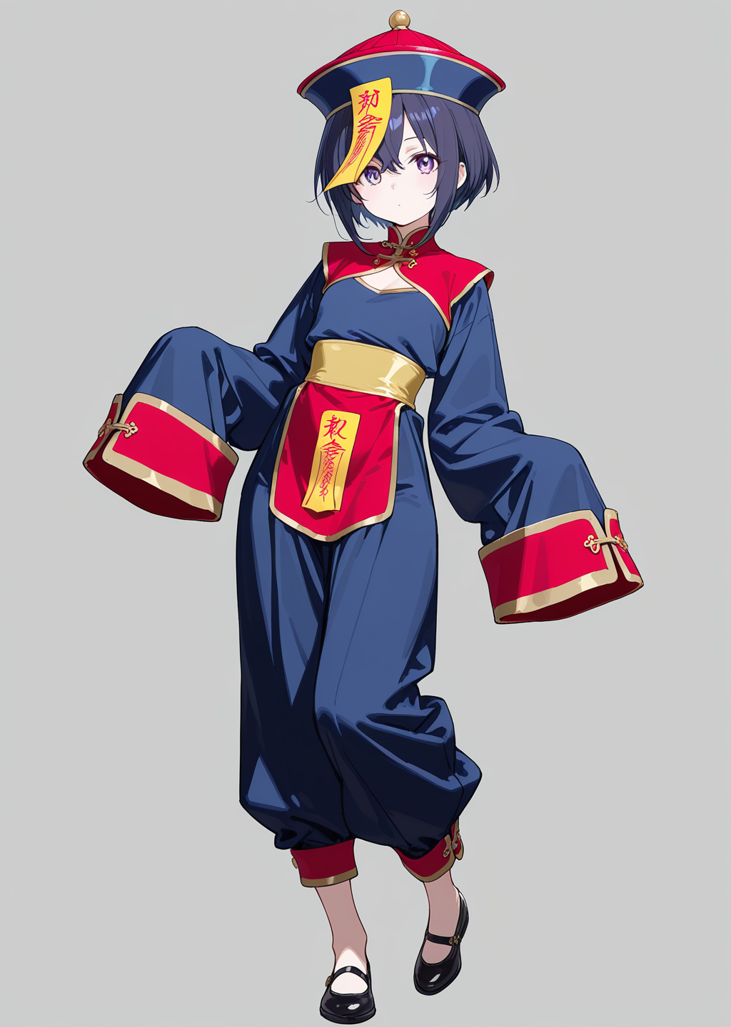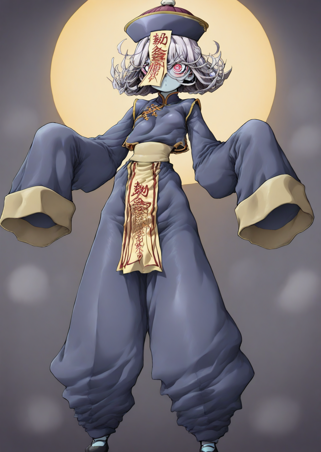 프롬프트: Jiang5hi, 부적, fulu_on_head, 창백한, 파란 피부, 중국 옷, ofuda, 머리에 부적,