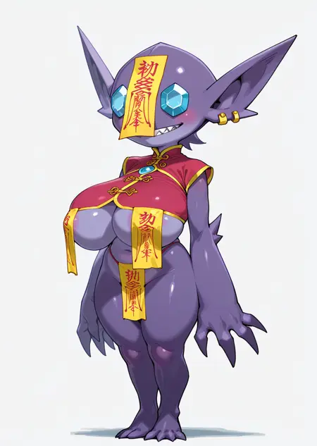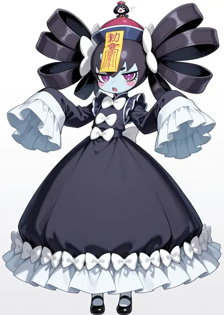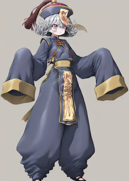 Prompts: Jiang5hi, talisman, fulu_on_head, pale, blue_skin, chinese_clothes, ofuda, talisman on head,