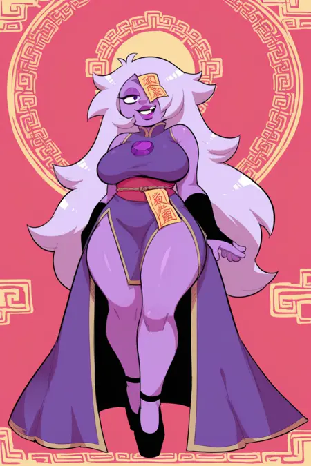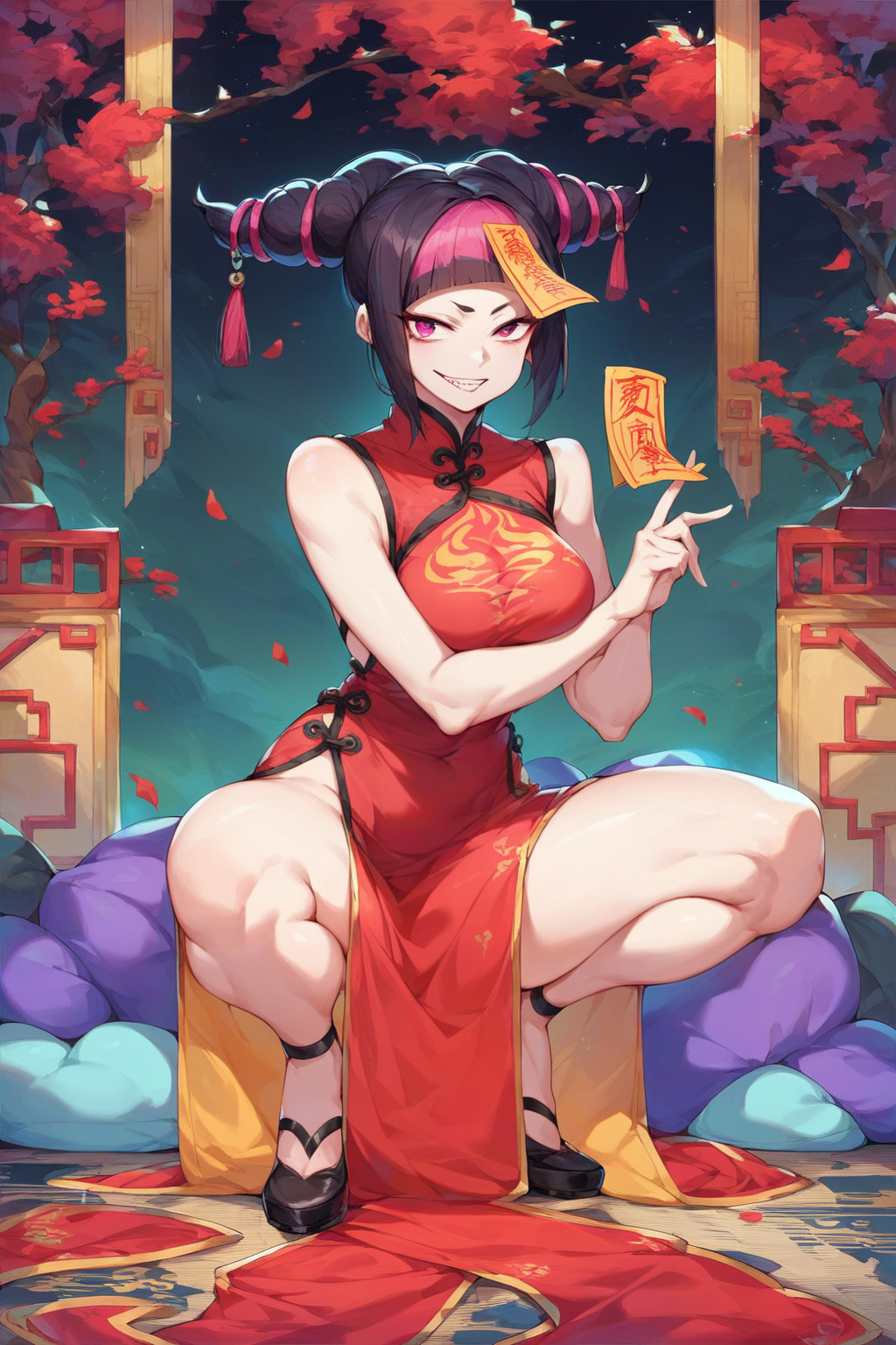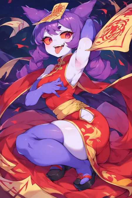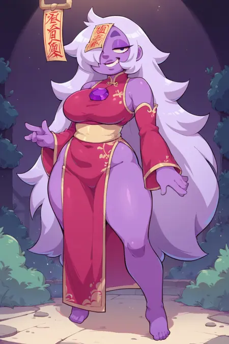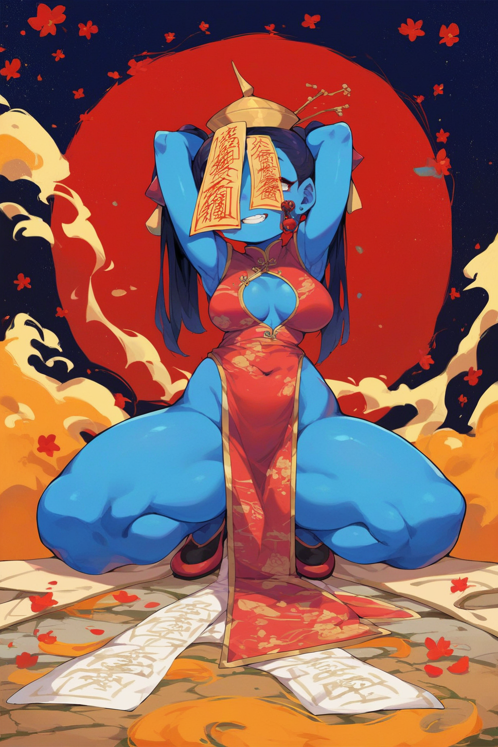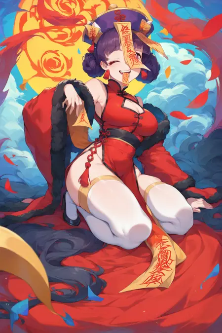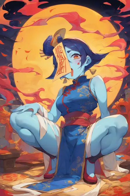 Prompts: Jiang5hi, talisman, fulu_on_head, pale, blue_skin, chinese_clothes, ofuda, talisman on head,
