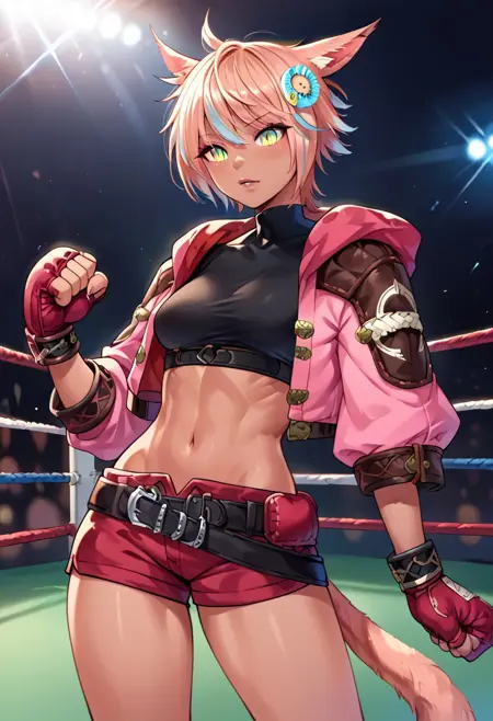 Yaana (얼굴): yaana, 1girl, miqo'te, 검은 피부, 고양이 눈; 선택 사항: 머리 장식, 분홍색 머리, 여러 색상의 머리