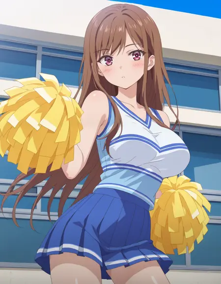 衣装3: チアリーダーの制服、ツートーン、シャツ、青いシャツ、ミニスカート、青いスカート、黄色のポンポン