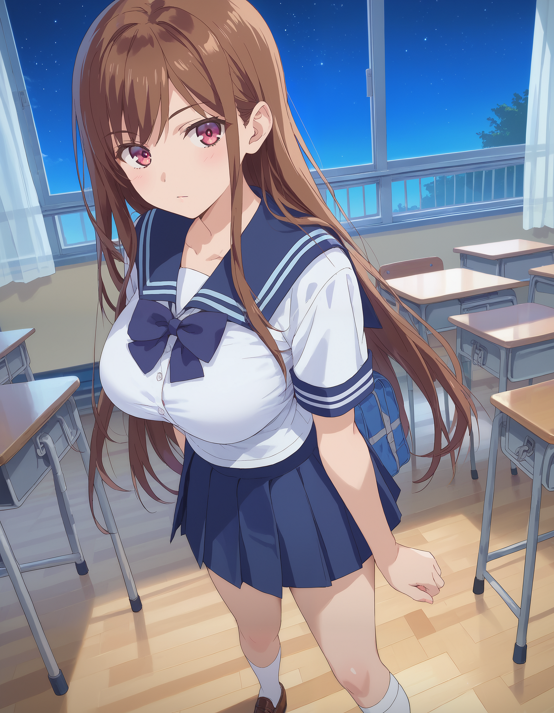 衣装1: 学校の制服、白いブラウス、青いセーラー襟、ミニスカート、青いスカート、白い靴下、茶色の靴