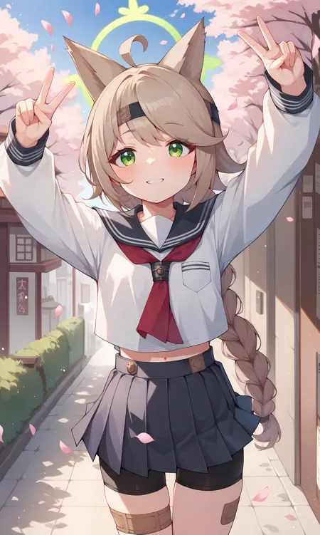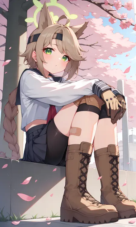 옷차림: 흰 셔츠, 긴 소매, 갈색 장갑, 세라후쿠, 빨간 넥커치프, 검은 치마, 주름 치마, 바이크 숏츠, 치마 밑 단축바지, 무릎 패드, 붕대, 다리에 붕대, 갈색 부츠