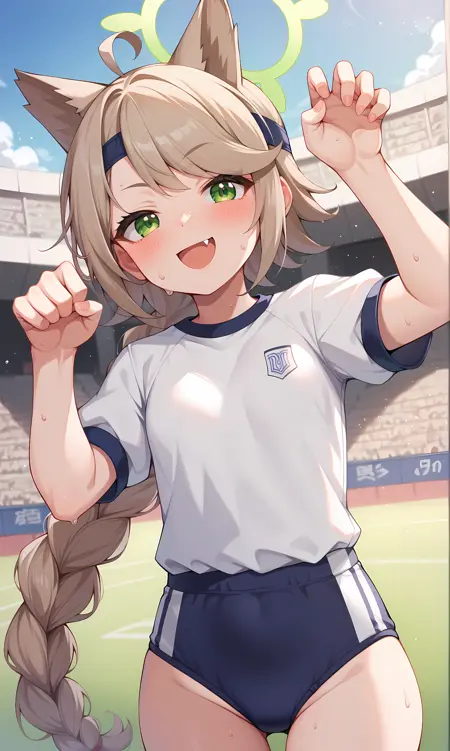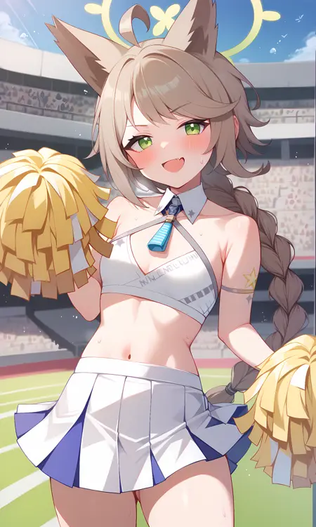 외모: 오토기, 녹색 눈, 연한 갈색 머리카락, 아호게, 긴 머리, 낮은 꼬리, 땋은 꼬리, 동물 귀, 환상, 머리띠