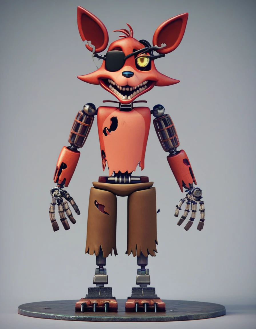 withered_foxy, solo, smile, 1boy, standing, full body, yellow eyes, male focus, teeth, furry, furry male, sharp pirate hook for left hand, damaged, robot, black eyepatch covering right eye, thin torso, brown pants, robot joints