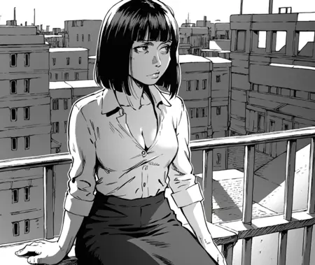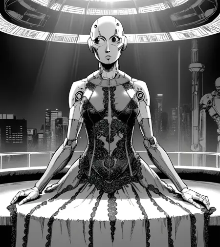 Monochrome comic/manga inked style, dark, grim and raw, with a nod to cyberpunk theme.