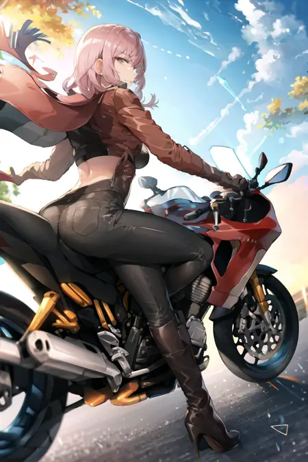 neon lights, night, starry sky, motorcycle helmet, holding helmet, helmet removed, taut clothes, bodysuit, skin tight, biker clothes, bikesuit, gloves, fingerless gloves, pants, jacket, navel, midriff, crop top, belt, open jacket, open clothes, jewelry, cropped jacket, earrings, clothing cutout, boots, cleavage, center opening, unzipped, no bra, bracelet, short shorts, thighhighs, piercing, skindentation, ear piercing, black nails, fishnets, leather, shorts, thigh boots, cross-laced clothes, bikini top only - 이 프롬프트들은 이 모델이 훈련된 데에서 많이 사용된 일반적인 단어들입니다. 필요시 추가해보세요.
