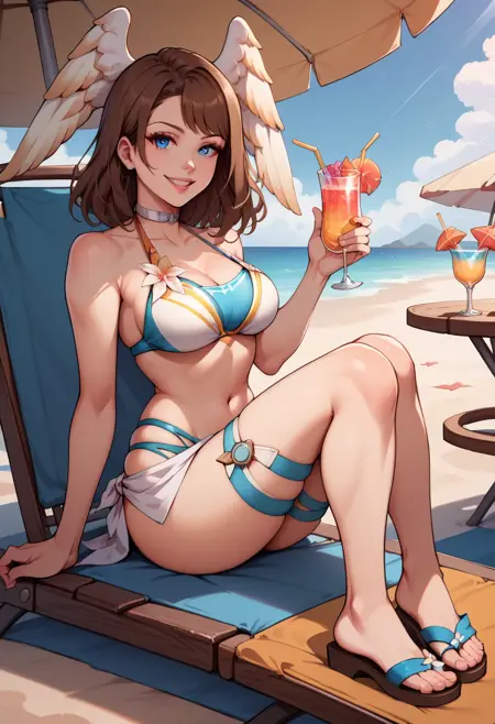 彼女の水着: "EunieSwim, head wings, blue eyes, medium hair, brown hair, white choker, multicolored swimsuit, multi-strapped bikini bottom, sarong, thigh strap"
