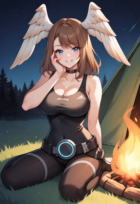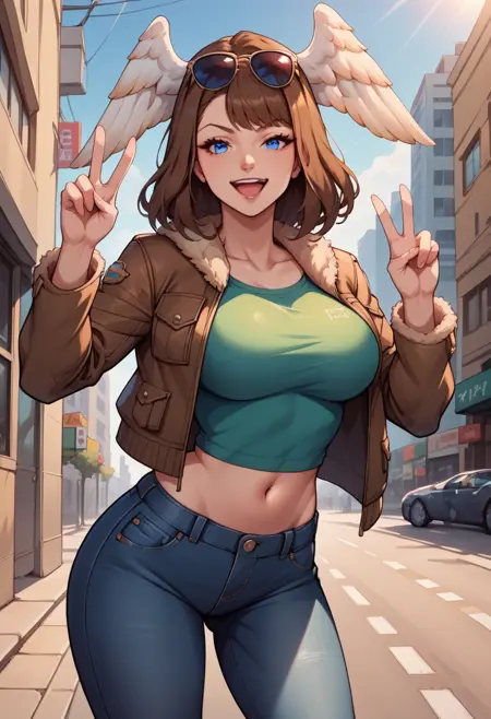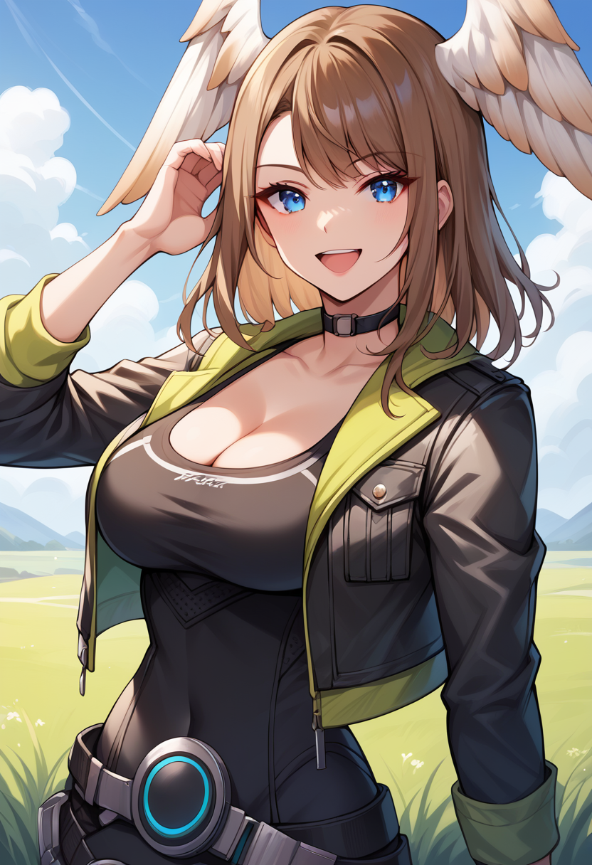彼女のデフォルト衣装: "EunieXC3, head wings, blue eyes, medium hair, brown hair, two-tone jacket, black choker, open jacket, tanktop, leggings, belt, cleavage"