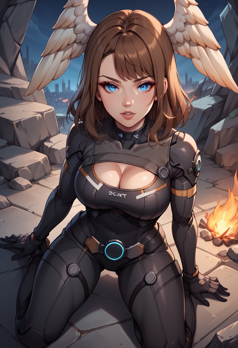 彼女の軍用ボディスーツ: "EunieXC3, head wings, blue eyes, medium hair, brown hair, bodysuit, cleavage cutout"