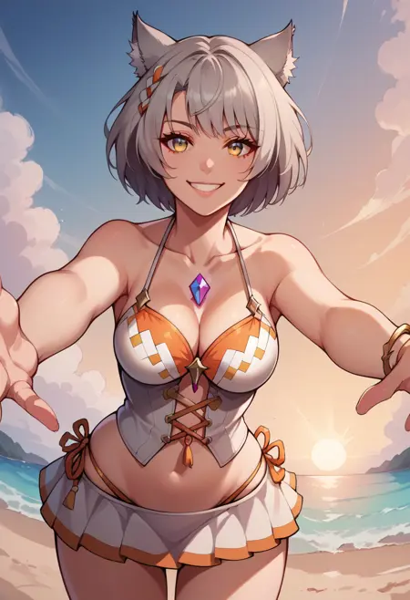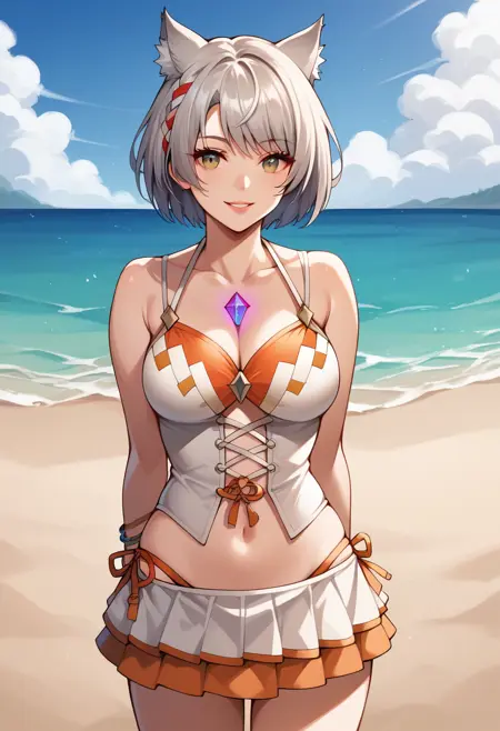 她的泳装为:“MioSwims,灰发,短发,猫耳,胸饰,泳装,交叉系带服饰,比基尼裙,多个手镯”。