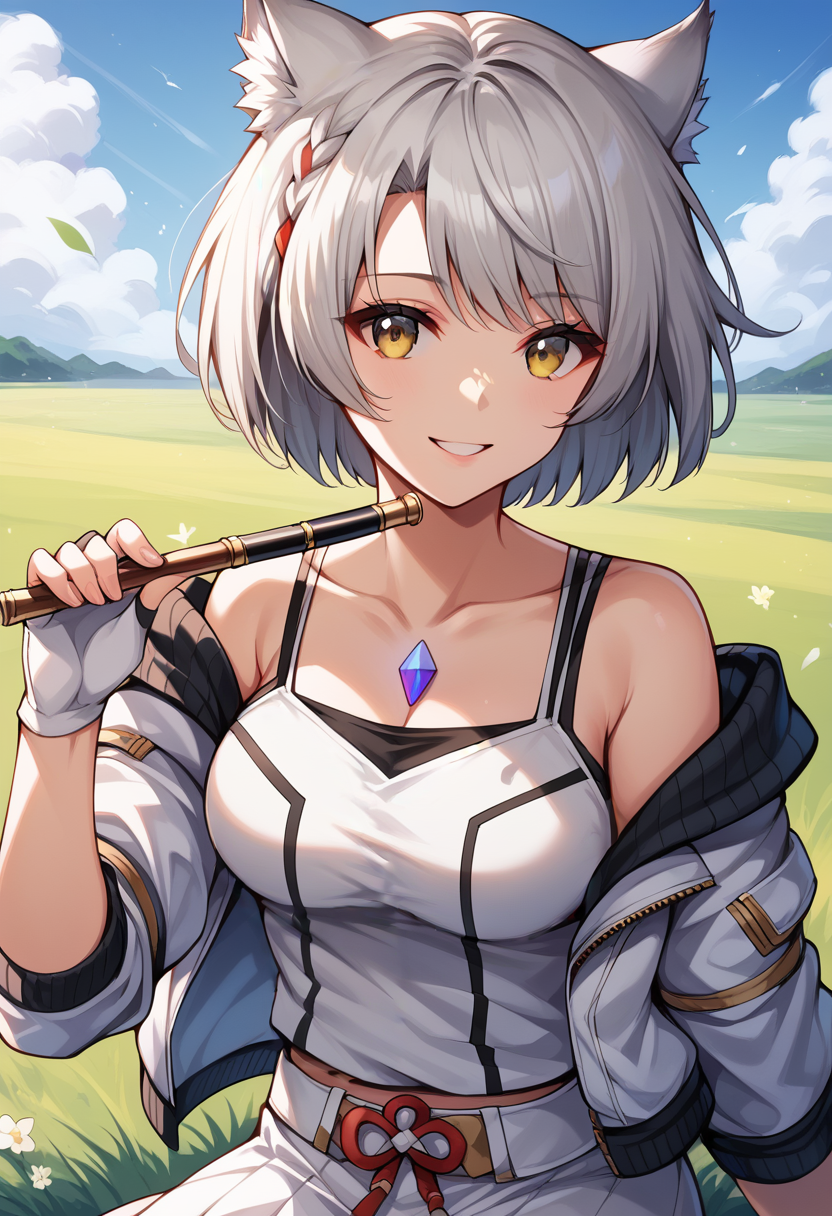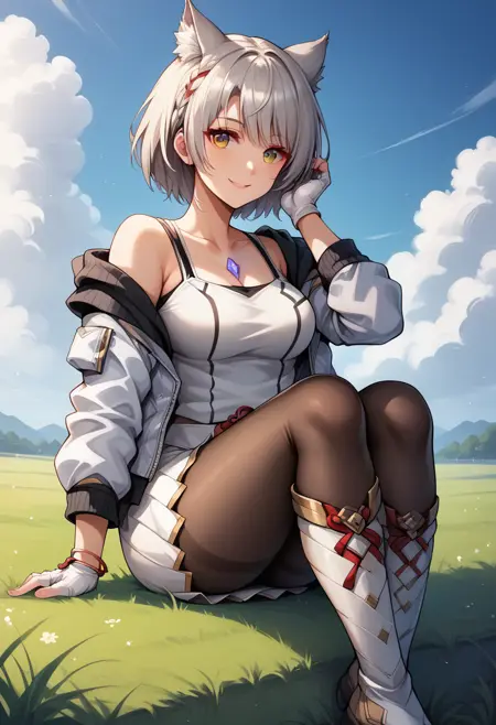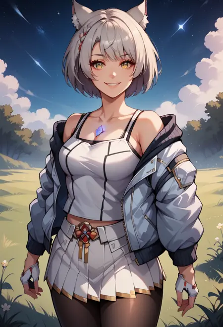 她的默认服装为:“MioXC3,灰发,短发,猫耳,白色背心,胸饰,敞开的夹克,露肩,荷叶边裙子,连裤袜,露指手套”。