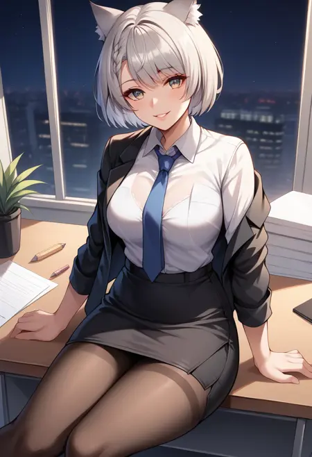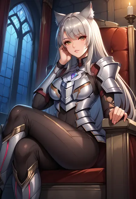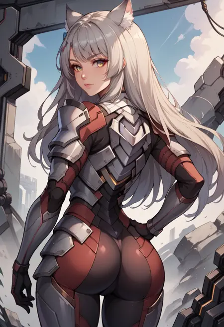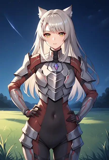她的Consul M服装为:“MioConsul,灰发,长发,胸饰,猫耳,盔甲,紧身衣”。