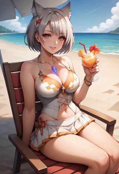 水着: "MioSwims、グレーの髪、短髪、猫の耳、胸のジュエリー、水着、クロスレースの服、ビキニスカート、複数のブレスレット"