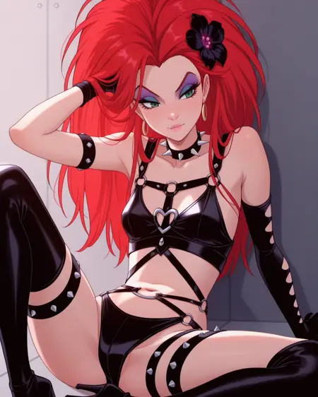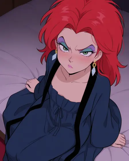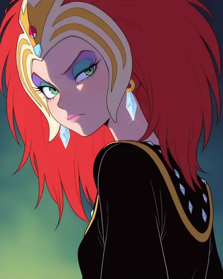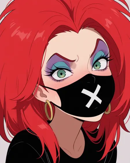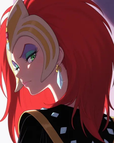 1girl, solo, ssdp1, red hair, green eyes, gold headgear, black outfit, diamond studs, diamond earrings, eyeshadow, makeup