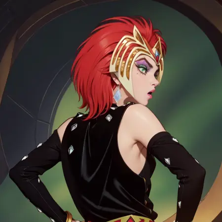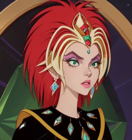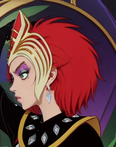 1girl, solo, ssdp1, red hair, green eyes, gold headgear, black outfit, diamond studs, diamond earrings, eyeshadow, makeup